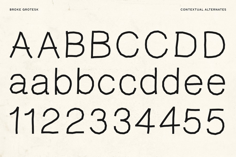 Broke Grotesk is a hand-drawn sans serif typeface. It is flawed by design–yet very legible–giving any project a human touch as an alternative to a standard sans serif.