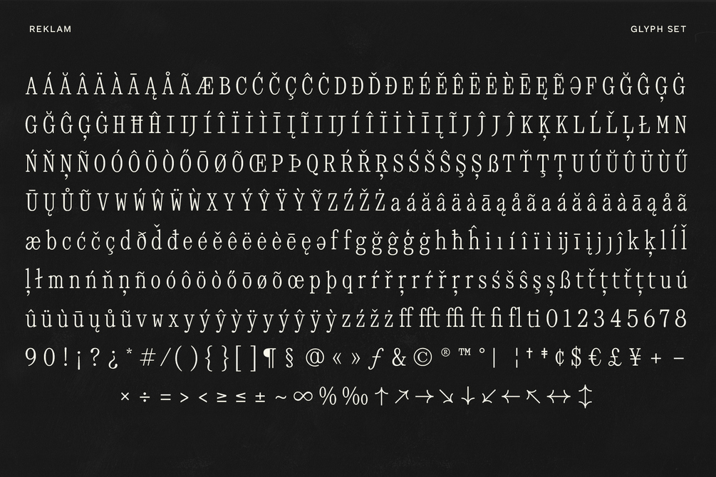 Reklam is an elegant, retro serif family with variable weights and widths. With its unique letterforms full of 90s retro personality, this sophisticated yet quirky typeface can work well for long-form text, but really stands out at headline sizes. The narrow widths have a nostalgic editorial feel and the wider versions work great for smaller text. This serif includes accents & multilingual characters.